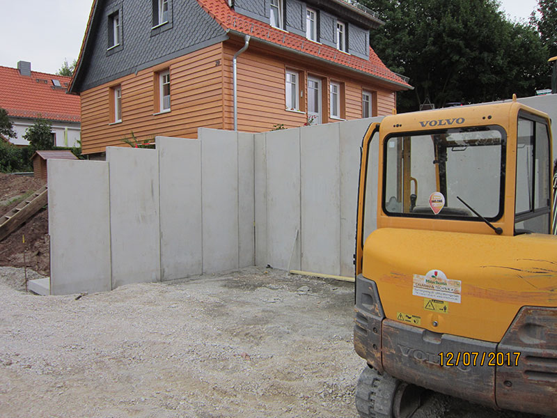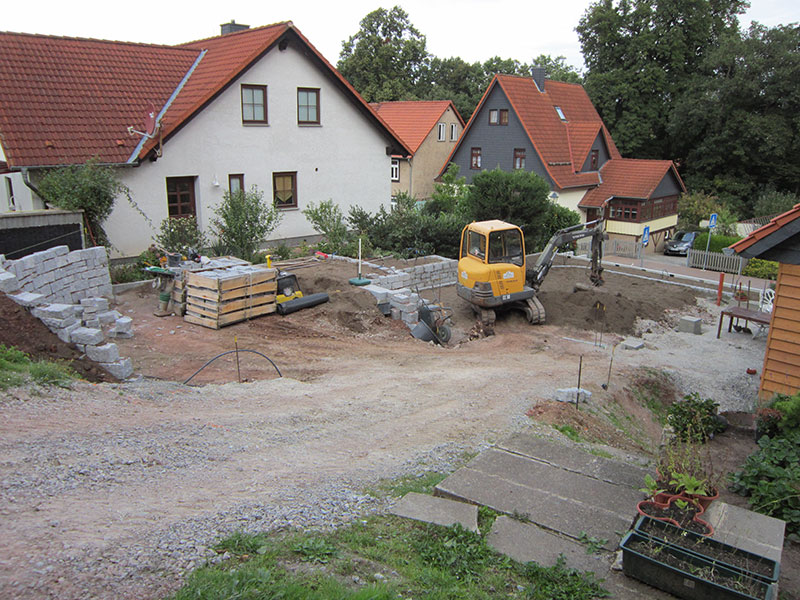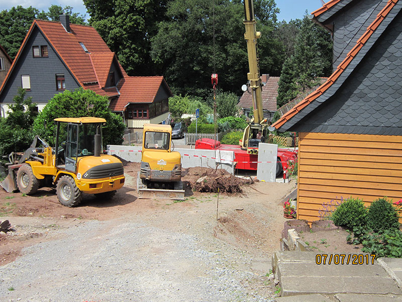 Gartenumgestaltung eines renovierten, harztypischen Einfamilienhauses. Vorgelagert, eine durch Winkelstützen gesicherte Carportfläche. Terrassierte Gartenbereiche mit Trockenmauern aus Granit, sowie die Wiederverwendung alter Granitelemente, hier sichtbar im Bereich der Haupttreppe.